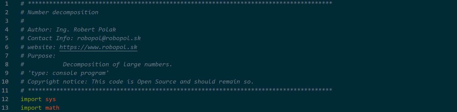 Tento diel je venovaný rozkladom veľkých čísiel na súčin prvočísiel (prvočíselný rozklad). Každé číslo sa dá rozložiť na súčin prvočísiel. Tento program bol vytvorený v programovacom jazyku Python. Ide o konzolový program. Pre spustenie je potrebné si nainštalovať Python, alebo si program spustiť online cez prehliadač. Bližšie o inštalácii a spustení programu v Pythone nájdete v článku: Matematika v Pythone.