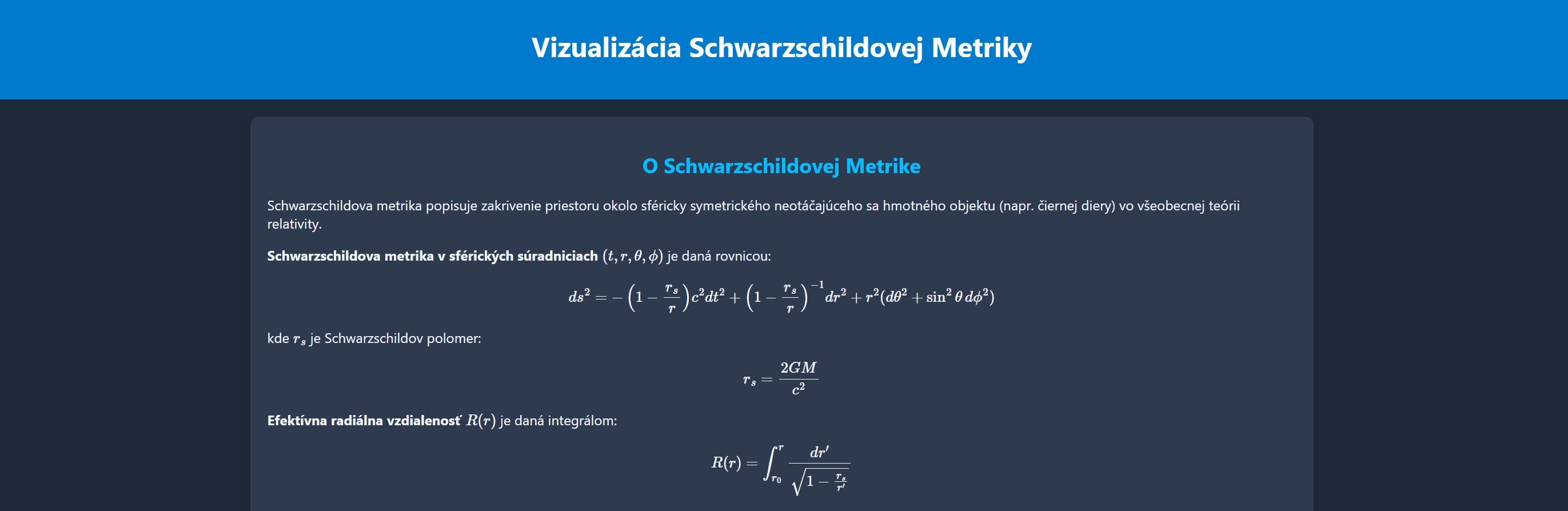 Táto webová aplikácia poskytuje niekoľko interaktívnych grafov, ktoré vizualizujú Schwarzschildovu metriku: